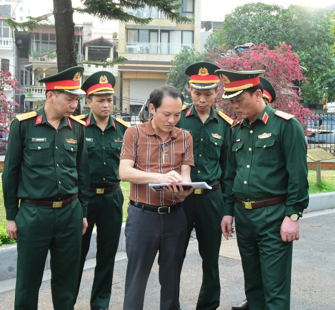 Thủ trưởng Bộ Tư lệnh Thủ đô Hà Nội nghe đơn vị tư vấn thuyết minh về phương án cải tạo cảnh quan xung quanh các hiện vật chiến tích ngoài trời.
